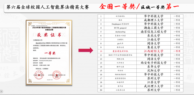 这些主动探索与实践,他在大学期间均一一落实。凭借对人工智能领域的初步学习和了解,他成功斩获第六届全球校园人工智能算法精英大赛—算法挑战赛—钢材表面缺陷检测与分割赛道全国一等奖。他回忆道:“国赛初期我们成绩欠佳,当时赛方明确要求模型参数规模需控制在1M以内。”他们先尝试调整模型结构、优化核心模块,但性能整体提升有限,且国赛仅剩不到一周,不同方案的试错成本已不允许他们在模型上继续反复尝试。意识到这一问题后,他们果断调整方向,将主攻重点从“修改模型” 转向 “专攻数据增强”,经过采用多种增强策略,借助多张显卡并行运行多个训练方案以高效试错,核心目标是精准拟合赛方提供的测试数据集分布。最终8k 原始数据扩充至 16.8w 规模,通过这种“过拟合” 的方式积累的大量细节分数,他们的队伍成功跻身全国第十。