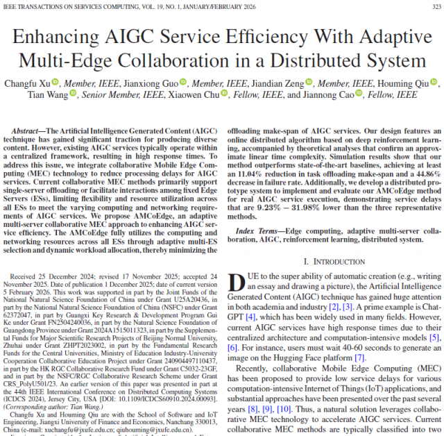 近日,体育博彩-在线体育博彩-博彩投注 徐常福老师以第一作者在服务计算领域国际顶级期刊IEEE Transactions on Services Computing(CCF A类期刊,校定A类期刊)上发表论文,论文题目为“Enhancing AIGC Service Efficiency with Adaptive Multi-Edge Collaboration in A Distributed System”。